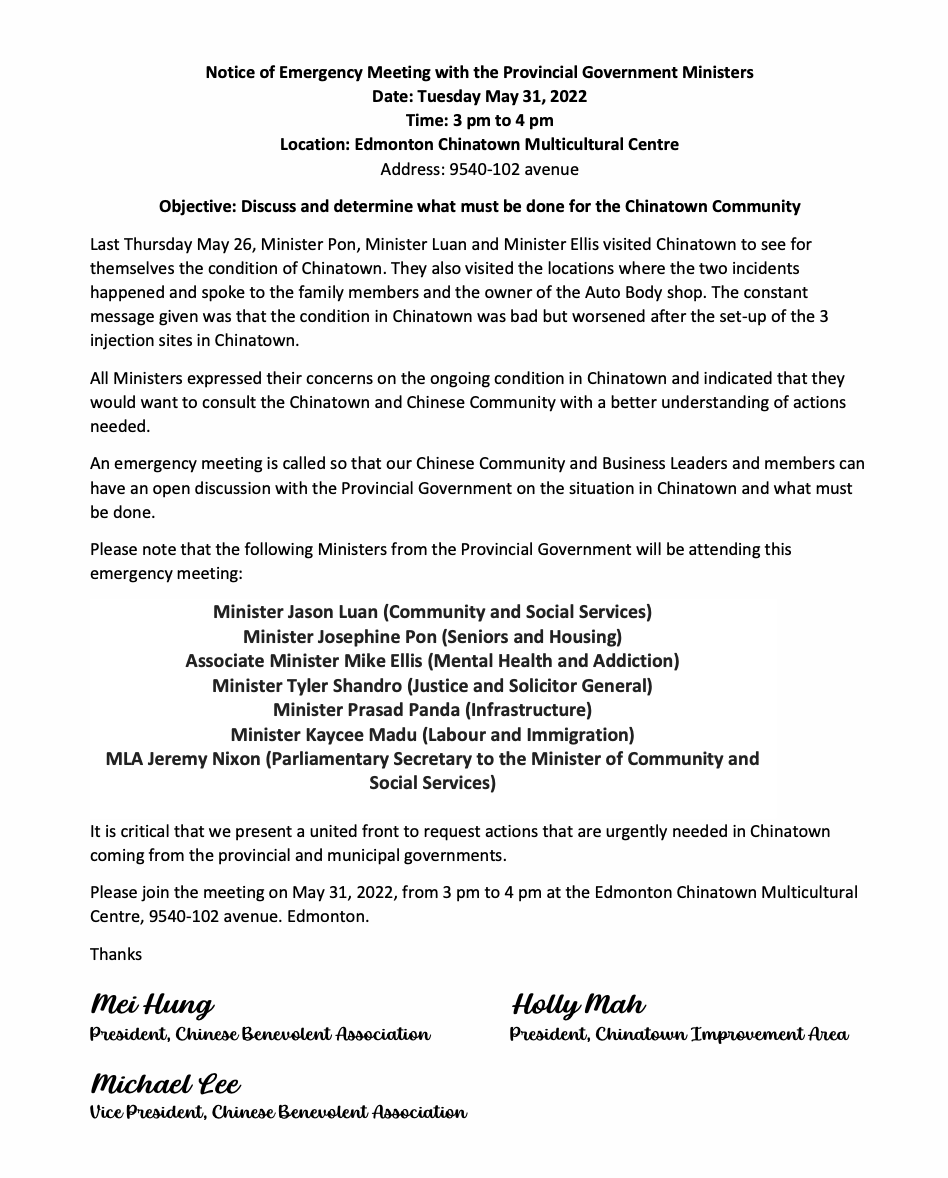 May 31: An “Emergency Meeting with the Provincial Government Ministers” is called in a letter signed by representatives from the Chinese Benevolent Association and the Chinatown and Area Business Association. It is held at the Edmonton Chinatown Multicultural Centre and according to the flyer this meeting was attended by Justice Minister Tyler Shandro, Labour Minister Kaycee Madu, Housing Minister Josephine Pon, Infrastructure Minister Prasad Panda, Associate Minister of Mental Health and Addictions Mike Ellis and UCP MLAs Jason Luan and Jeremy Nixon.