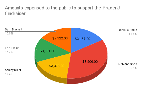 The biggest spender on the PragerU trip by a longshot was Rob Anderson, who charged taxpayers $6,906—more than double the second-biggest spender, Ashley Miller, who spent $3,376 in public funds. Premier Smith expensed $3,178, Emma Taylor spent $3,061 and Sam Blackett expensed $2,922.